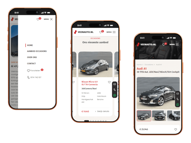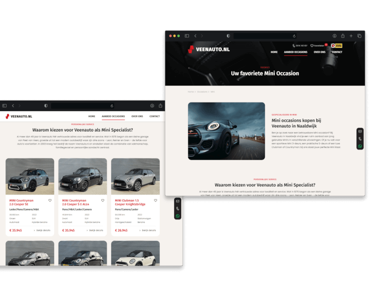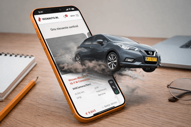 Voor Veenauto.nl ontwikkelden we een moderne, conversiegerichte website die meer doet dan alleen auto's tonen. Dankzij een slimme koppeling met WheelerDelta wordt het occasionaanbod automatisch bijgewerkt. De site bevat daarnaast real-time filters, conversiegerichte landingspagina’s en een helder, mobielvriendelijk ontwerp.
